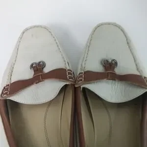 and brown leather flats. These shoes feature a classic moccasin-style construction with visible stitching and decorative leather laces and a sling back heel offering a timeless look. Ideal for casual outings, they bring a touch of nautical-inspired elegance to any ensemble.