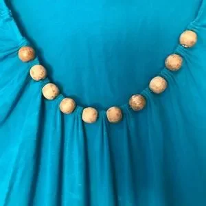 Grace Elements sleeveless top. Scoop neckline embellished with wooden beads. Banded hem. Approximate measurements flat lay shoulder to shoulder 18". Underarm to underarm 21". Bottom of top side to side 18 1/2". Length from outside shoulder to bottom of band 25 1/2". Comfy summer sleeveless turquoise pullover top with wooden beads. Softly flowing from slightly gathered neckline to banded hem. Boho gypsy cool wood beaded business casual vibrant bohemian summer top can be worn with lightweight blazers or sweaters jeans skirts or shorts.