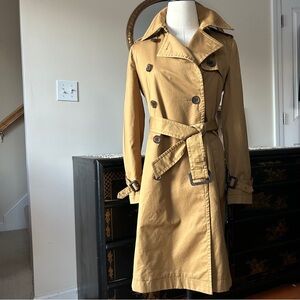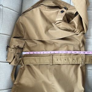 J. Crew Classic Double Breasted Trench Coat in 100% Cotton. Hard to find, from Fall 2015 Collection. Made with all the best finishes from including Leather Buckles on the belt and cuffs and double hook & eye closures at the collar if you choose to wear it that way (see last photo please). Blue & White Striped body lining is 60% Cotton/40% Polyester. I believe the size on this trench has to be mismarked — it says 000, but it fit me perfectly when I bought it and wore a 0/2 at the time. It is shown on my Size 2 dress form. Mind you she is not wearing anything heavy underneath. Measurements: 18” across (from the back), underarm to underarm/side seam to side seam. Waist measured from the back is 16” across (& of course can be adjusted smaller with the belt). 36” long. 23” sleeve. EUC!