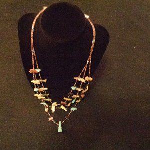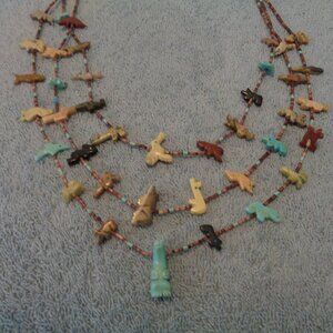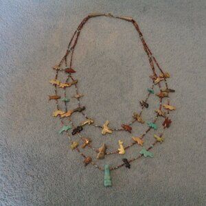 ZUNI VINTAGE TRIPLE STRANDS HAND CARVED ANIMAL FETISH NECKLACE