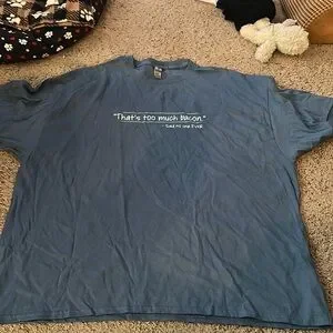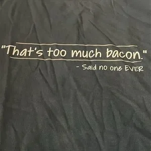 Blue-gray cotton short-sleeved tee, says “That’s Too Much Bacon - Said No One Ever” on the front