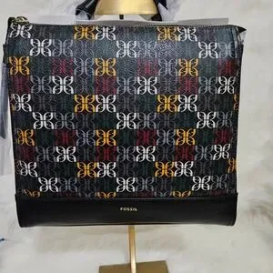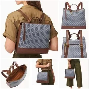 The Fossil backpack showcases a captivating geometric pattern in blue, complemented by rich brown leather accents for a chic and modern appeal. Its structured, boxy design and adjustable straps ensure comfort and style, making it an ideal choice for everyday adventures.