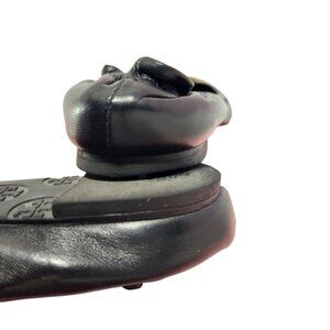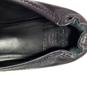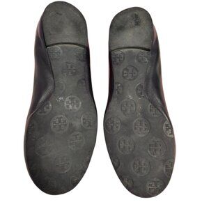 These Tory Burch flats feature a sleek black leather design accented by a gold-tone double T logo medallion, offering a blend of elegance and comfort. The soft leather and classic round-toe silhouette make them a timeless addition to any wardrobe.