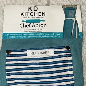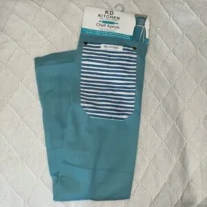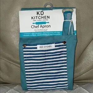 NWT KD KITCHEN Stylish chef apron in blue with a striped white pocket. Features adjustable neck and long straps. 26x32”. 100% cotton. Smoke & pet free home.