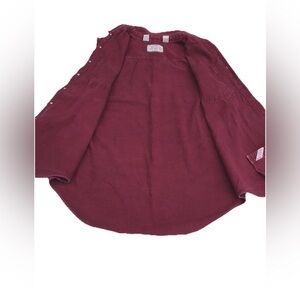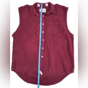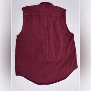 Stylish burgundy sleeveless button-up shirt. Features two front pockets and a classic collar.