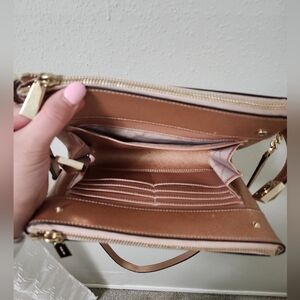 Elevate your style with this chic Michael Kors crossbody bag. Crafted in a versatile tan/peach color, it's perfect for any occasion. Two small zippers for phone and keys.