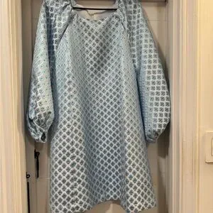 NWOT Hill House Home special occasion Araminta mini dress in metallic blue snowflake fabric in size XXL. Features shift style fit with bell sleeves.