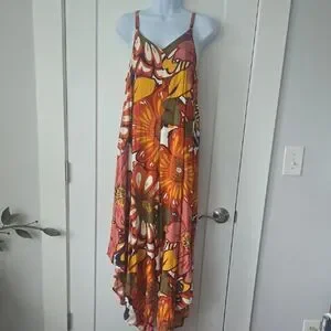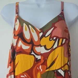 This sleeveless romper by MSK features a striking asymmetrical high-low hemline, perfect for resort wear. The vibrant orange and brown color palette is complemented by spaghetti straps, offering a breezy and stylish look. Crafted from a lightweight fabric, it ensures comfort and elegance in warm weather.
