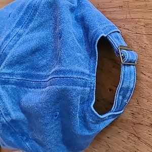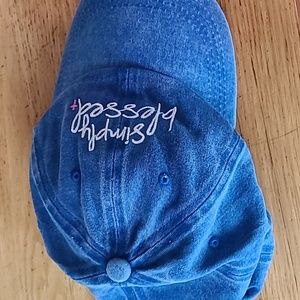 NEW womans (unisex) blue Jean fabric ball cap. embroidery "simply bless" in white with a tiny pink cross. adjustable strap in back.
