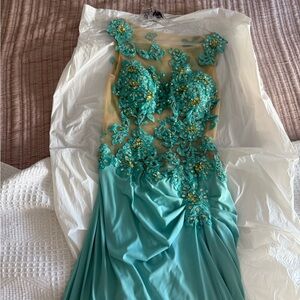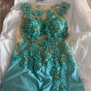 Step into elegance with this stunning turquoise evening gown. Perfect for special occasions, this dress features intricate detailing and a flattering silhouette. Make a statement with its vibrant color and exquisite design.