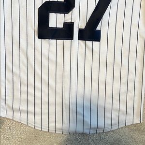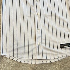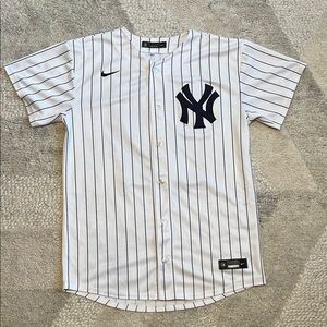Classic New York Yankees pinstripe jersey by Nike. Features iconic navy stripes and logo.