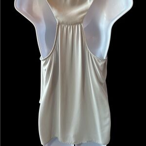 This Banana Republic top features a chic asymmetrical design in a soft cream color. The sleeveless tank style offers a relaxed fit, perfect for a breezy, effortless look. Its minimalist aesthetic and airy fabric make it a versatile piece for any wardrobe.