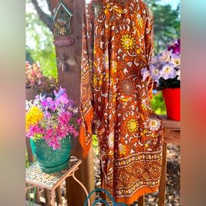 Free People Bold Boho Cinnamon Orange Yellow Tan Floral Paisley Patterned Open Soft Ruana Kimono