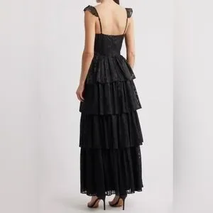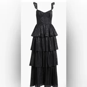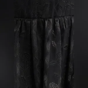 This elegant black tiered dress is perfect for any occasion. Its floral satin jacquard design and ruffle detail make it a versatile addition to your wardrobe.