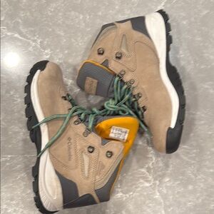 These Columbia ankle waterproof HIKING boots feature a tan suede leather upper with a gray padded collar, offering both style and comfort. Designed for durability, they provide excellent ankle support and are perfect for outdoor adventures. The rugged construction and reinforced toe area ensure these boots are ready for any terrain.