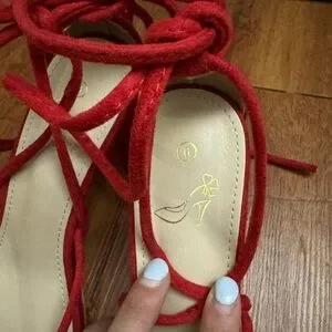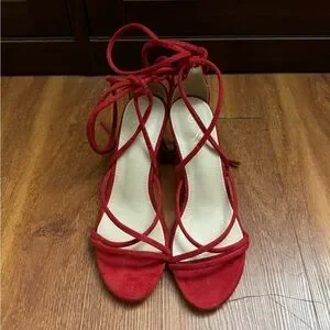 Step out in style with these elegant red suede lace up strappy sandals. Perfect for any occasion, these shoes offer both comfort and fashion. 3.5” heel.