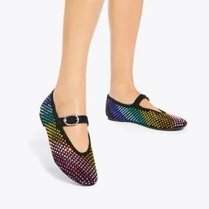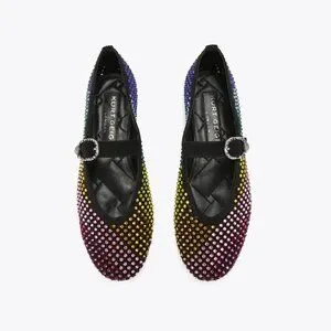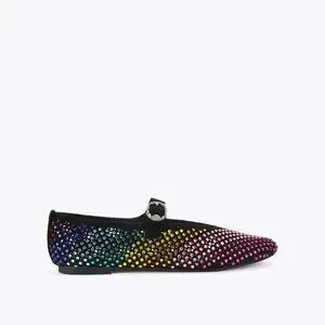 The Mayfair Ballet Flat features a black suede upper with perforated holes and rainbow stripe crystal design.