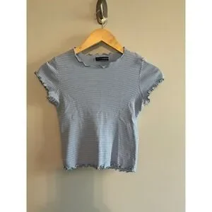 Keywords: Brandy Melville, striped tee, ringer tee, crop top, lettuce edge, blue and white, short sleeve, casual top, women's top, summer top, fitted tee, ribbed tee, vintage style, y2k fashion
