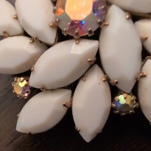 Elegant brooch with white milk glass and iridescent Aurora borealis accents. Perfect for adding a touch of vintage charm.