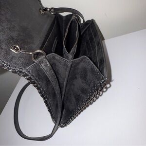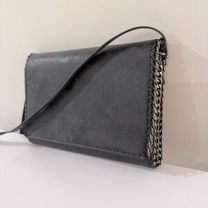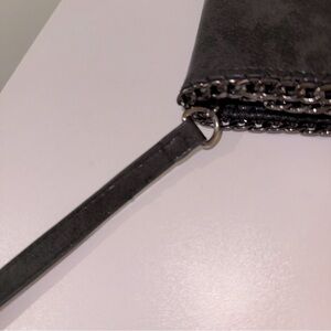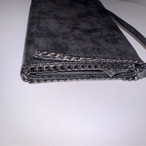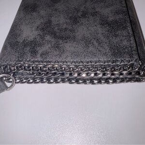 This stylish charcoal colored bag features a chic chain trim, perfect for any occasion. Its sleek design adds a touch of elegance to your outfit.