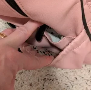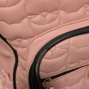 This stylish pink backpack features a charming quilted cat pattern, perfect for adding a playful touch to your outfit. Ideal for everyday use, it combines fashion with functionality.