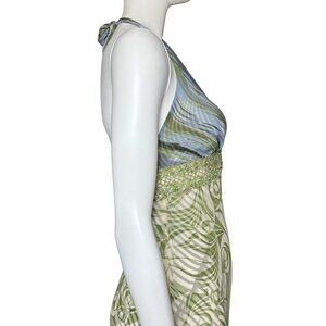 Abstract blue and green watercolor stripe pattern on the bodice and green and white floral swirl pattern on the skirt. Sheer band at the empire waist with green sequins in a floral pattern and embroidery. Sheath silhouette with a low back or backless, tie neck halter style. Sheer layered chiffon fabric allows you to see the pattern repeated on the opposite side of the fabric in the sun. Zipper closure.