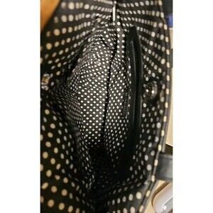 The bag boasts a spacious interior with multiple pockets, including an audio pocket, and is lined with black fabric with white polka dots. With a lightweight design, this purse is perfect for any occasion. The bag measures 9.5 inches in width and 9 inches in height, with a strap drop of 10 inches. Add a touch of flower-themed charm to your wardrobe with this gorgeous Bueno bag.