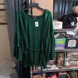 Shine in this stunning green metallic camisole with elegant ruffle sleeves. Perfect for a night out or a special occasion.from a smoke free home