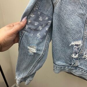 American Eagle denim jacket ripped distressed with patches. Size extra extra small. XXS. Jacket is an excellent condition.