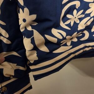 This elegant open-front blue and cream jacket features intricate floral pattern that adds a touch of sophistication to any outfit. The long sleeves give a modern, chic silhouette, making it versatile for both casual and formal occasions. With its unique detailing and tailored fit, this jacket effortlessly elevates your look when layered over a simple top. Perfect for adding texture and style to your wardrobe staples. this jacket is light in weight, but material is thick and provides warmth.