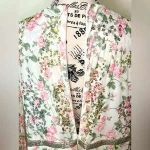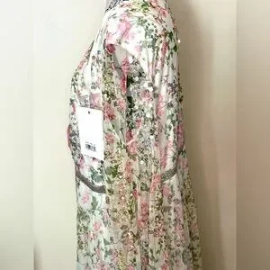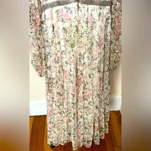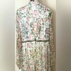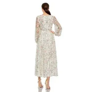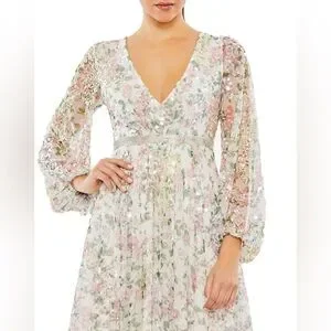 Elegant floral midi dress by Mac Duggal. Features a V-neckline and long sleeves. Perfect for special occasions.