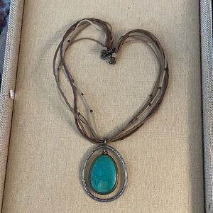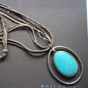 Silpada necklace has Howlite pendant with a sterling silver halo design, on a multi-strain necklace. Pendant is about 2" long. Necklace has beaded brass and silver accents. 18" long with a 2" extender and lobster clasp. Can be found in the 2012-2013 catalog, page 72B. New for $129.00. Display only, in excellent condition.