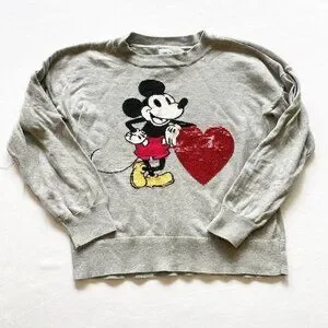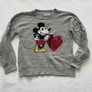 Gently used. Standard wear. There is a spot on front. I can't tell if it's a stain or part of fabric. Gray sweater with Mickey Mouse heart sequins. Gap Disney size medium (8). No holes. Smoke free home.