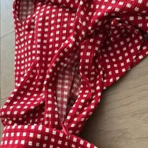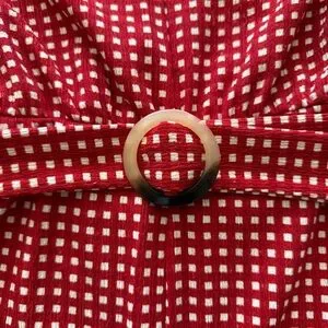 Chic red and white checkered jumpsuit. Perfect for casual outings. Comes with removable belt with brown and cream buckle. Features a side zipper and a button/keyhole back opening for easy access to put on. See website description for balance details. Worn once and washed!