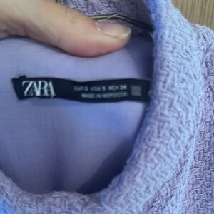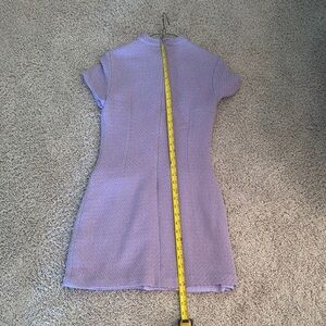 Stylish lavender dress with button-up front. Features short sleeves and a textured fabric.