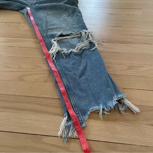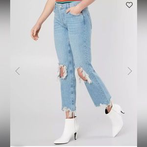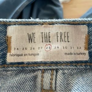 We The Free jeans. Light wash, destroyed knees, raw, frayed ankle hem. Hi rise. Hidden button fly.