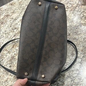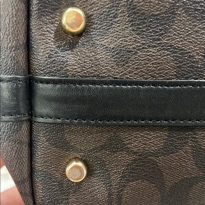 Elevate your style with this elegant Coach women's bag. Featuring a sophisticated brown and black design, this bag is perfect for any occasion. The high-quality craftsmanship ensures durability and timeless appeal. Missing the shoulder strap and does have a scratch on the gold metal tag. Very mild scratches on the buttons on the bottom of bag also shown in pictures