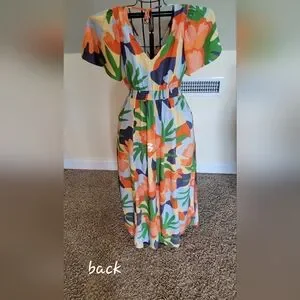 Vibrant maxi dress with a bold floral pattern. Features orange, green, yellow and blue hues.