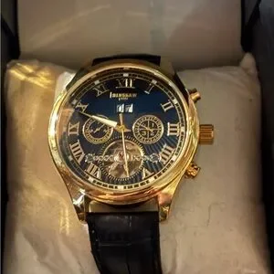 Elegant Binssaw watch with a gold case and black leather strap. Features a detailed black dial with gold accents.