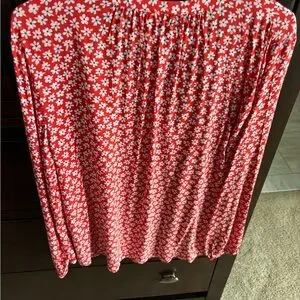 Vibrant red blouse with white floral pattern. Features long sleeves and a v-neckline.