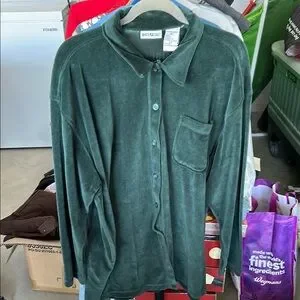 Soft green button down shirt. Features a classic collar and front pocket. Perfect for casual wear.
