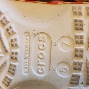 Crocs Fun pink clogs featuring colorful cartoon designs and playful charms. Perfect for adding a whimsical touch to your outfit. Pre-owned Size M 5 W 7