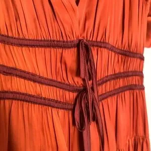 This elegant orange dress features a flattering V-neck and stylish puff sleeves. Perfect for any occasion, it offers a comfortable fit with a touch of sophistication.