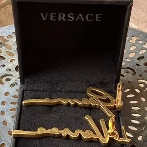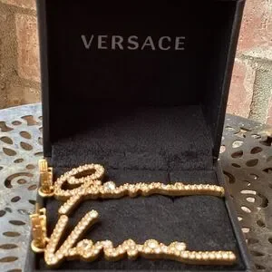 Elegant Authentic Versace gold earrings with signature design. Perfect for adding luxury to any outfit. Each earring is 3 inches in length. The first letter in each earring is 1 inch in width. These earrings come with both boxes shown in the photos. No scratches or defects!