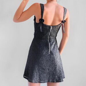 The perfect blend of sweet and sultry, this stunning mini dress is featured in a lovely sequins fabrication with corset inspired top, strappy shoulder detail, and classic ruffling for an added touch of dimension. Topped with a classic, A line fit, zipper closure at back, ribbon bow tie detailing, curved boning, and black colorway! Perfect to pair with a staple stiletto for timeless style or a bold boot