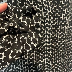 Stylish black and white blouse. Features a chic pattern. Perfect for any occasion.