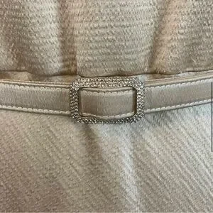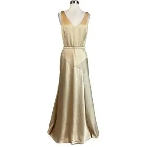 Elegant gold dress with a V-neckline. Features a belted waist and flowing skirt. Perfect for formal occasions.has a few small loose strings but not noticeable when worn. Make me an offer.
