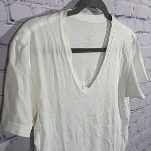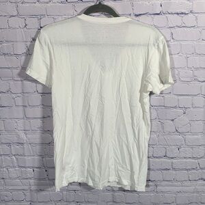Mens solid white tee in a short sleeve cut. V-neck font. Logo on bottom left of front.