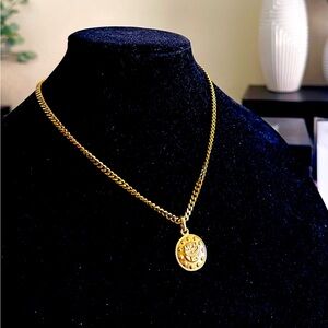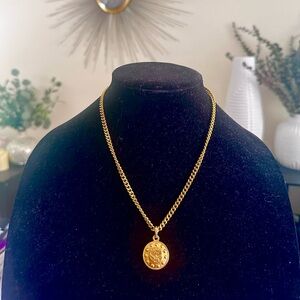 Elegant MCM gold plated pendant necklace. Features a round design with embossed details.