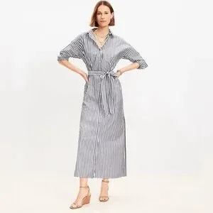 LOFT Light Blue Striped Poplin Belted Pocket Shirtdress